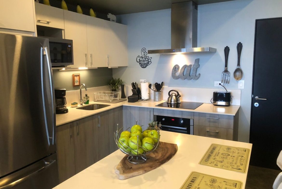 Precioso condominio con una vista espectacular y full amueblado. El apartamento consta de un cuarto, un baño, sala, cocina con isla desayunador, balcon con vista espectacular al oeste.